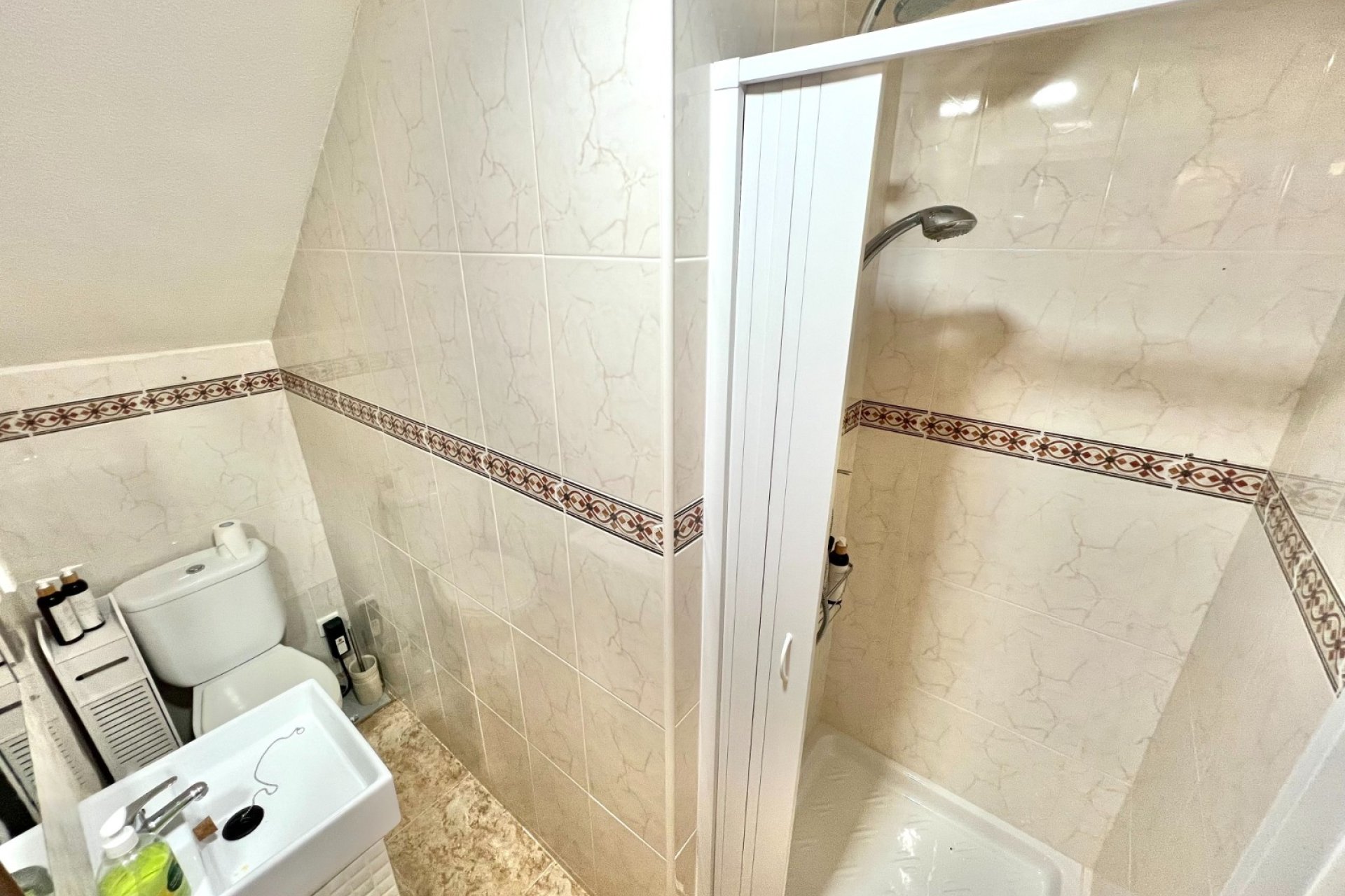El primer baño, ubicado en la planta baja, presenta acabados de alta gama en colores neutros, con ducha de pared a pared con mampara de cristal, inodoro y un moderno mueble de lavabo blanco con lavabo.