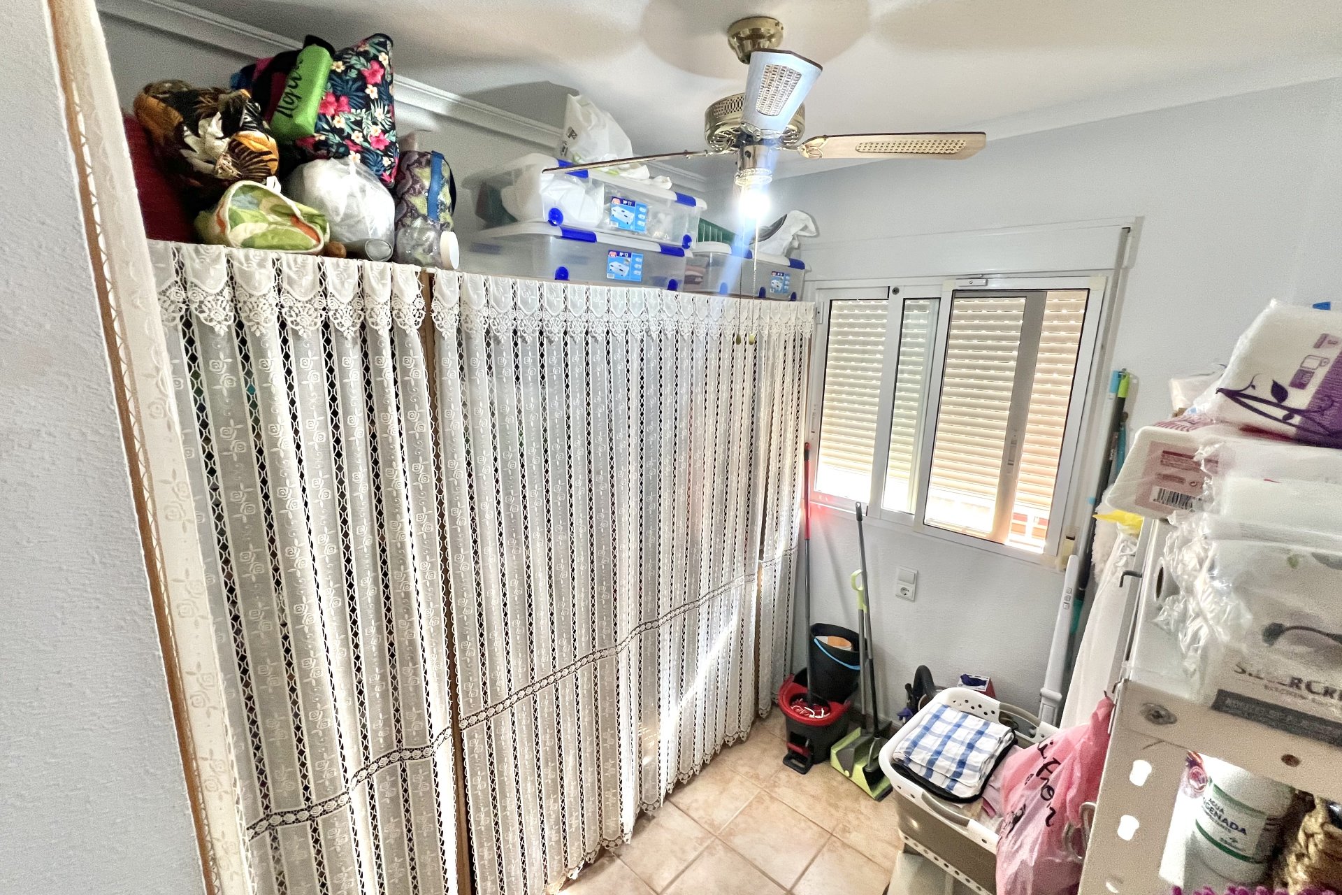 El primer dormitorio doble con ventilador de techo moderno, aire acondicionado y armarios empotrados. El segundo dormitorio con ventilador de techo actualmente se usa como trastero.