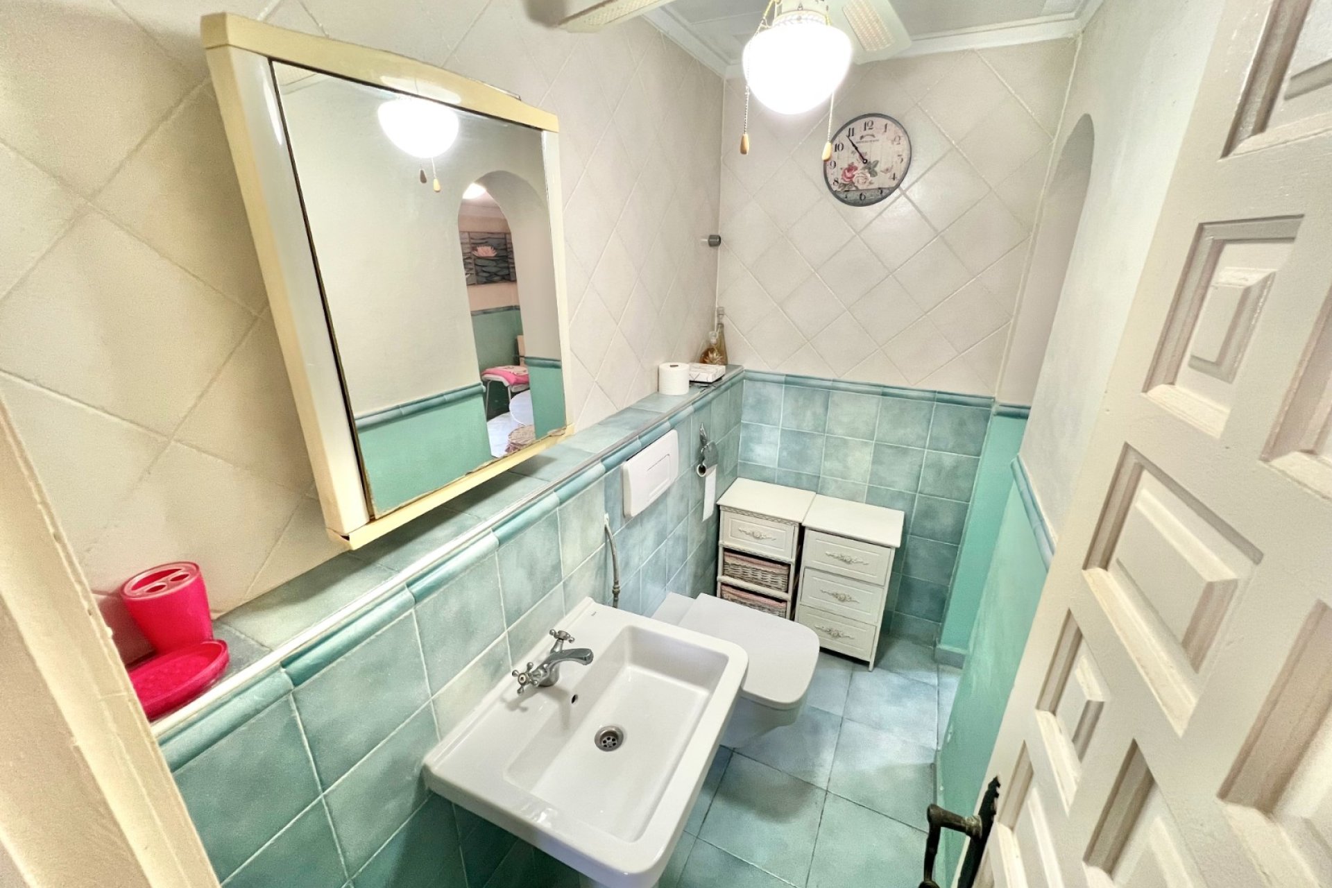 The villa comprises two bedrooms. The twin guest bedroom is equipped with a ceiling fan, while the master double bedroom features a walk-in wardrobe for ample storage. The family bathroom has been updated with a large easy-access bath, a separate walk-in shower with a glass screen, WC, and modern vanity unit with inset sink, all beautifully finished with gloss tiling and stylish fittings.