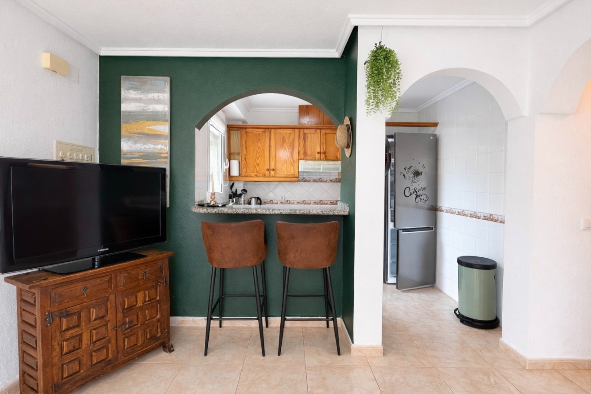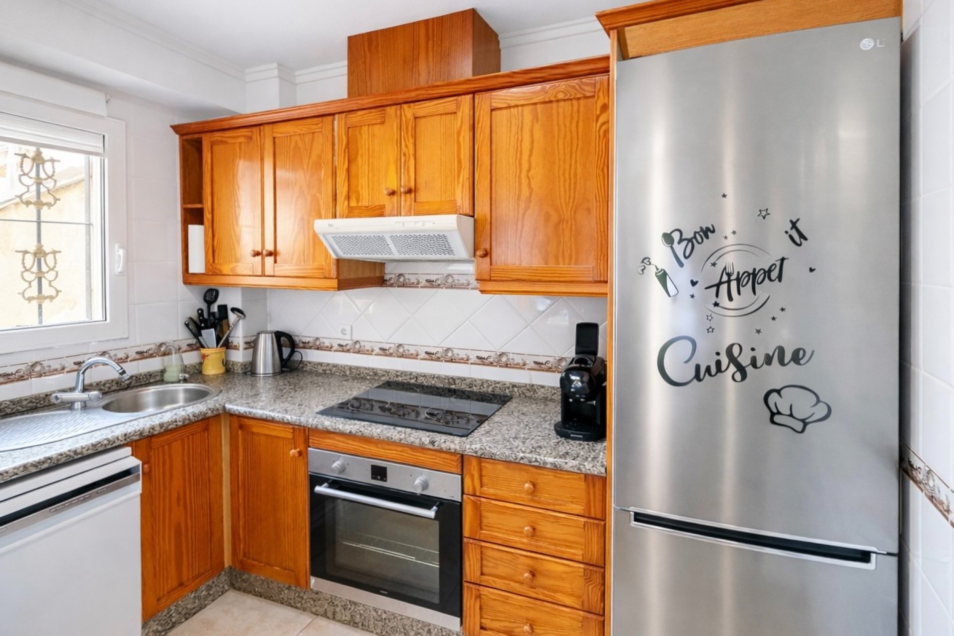 The kitchen is well equipped with a ceramic hob, electric oven, extractor hood, dishwasher, washing machine and fridge freezer, with a handy breakfast bar ideal for casual dining.