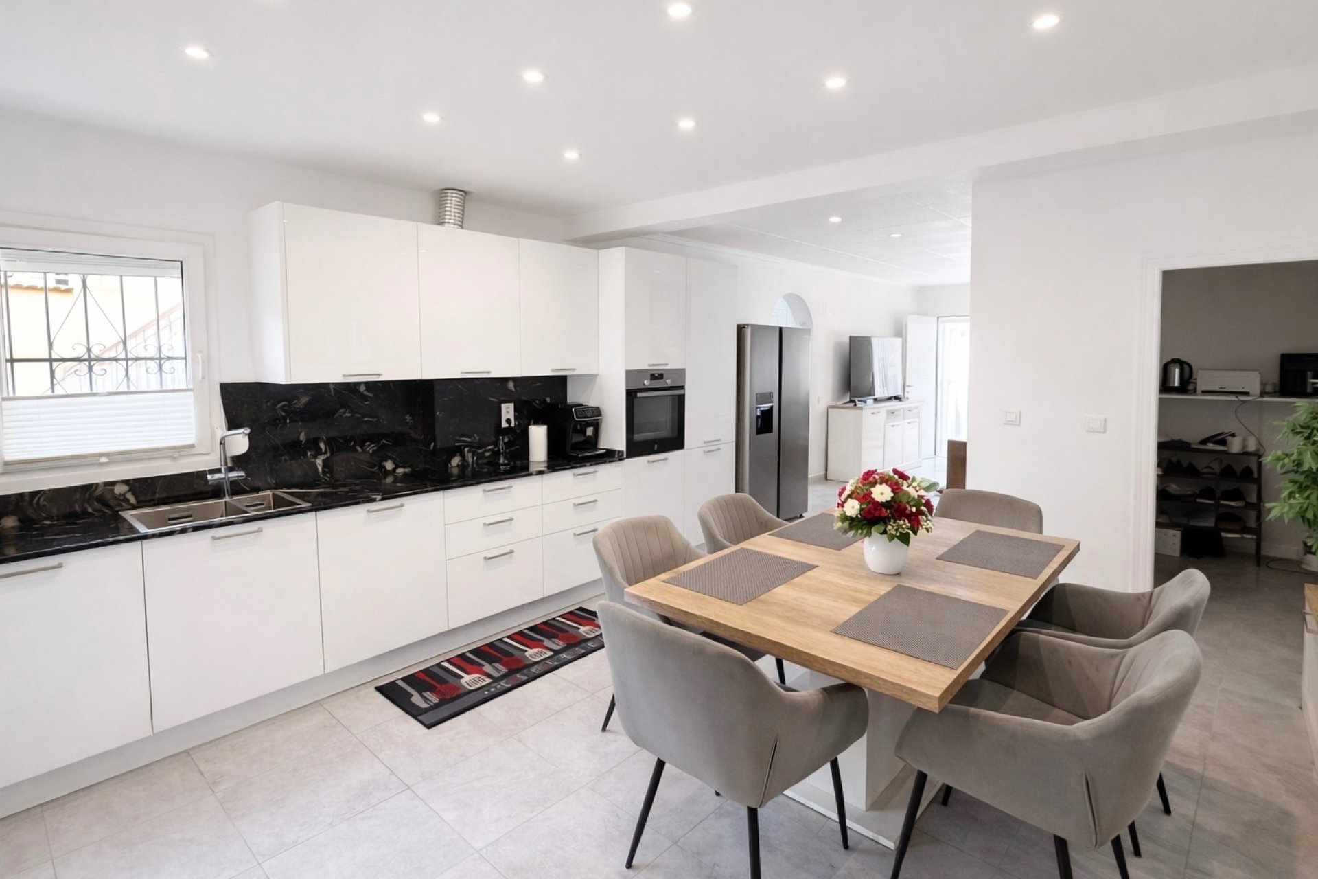 On entering the property we find a comfortable living room, tastefully furnished in a modern scheme, the living room comprises of air conditioning , from the living room we find a newly fitted modern kitchen / dining room, this really is the heart of the house, finished in White units with granite work surfaces, new electrical domestics, and filtered drinking water, to compliment this family room, offering a warm and friendly area the ceiling comprises of spot lights.We find further storage facilities with a walk in larder.An aluminium door leads out to the rear gardens, here we find artificial lawn with an exterior dining area and retractable fitted sun awning, a BBQ area and further storage, high walls offer privacy to this relaxing and comfortable secluded area.