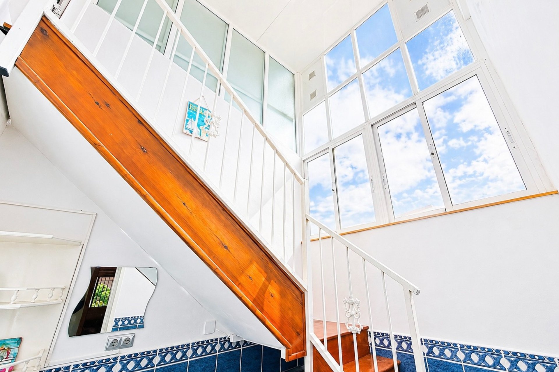 A charming wooden staircase leads to a bright conservatory, ideal as a second lounge or relaxation area. From here, patio doors open onto a superb sun-drenched solarium terrace, offering far-reaching views—perfect for entertaining or unwinding in complete privacy.